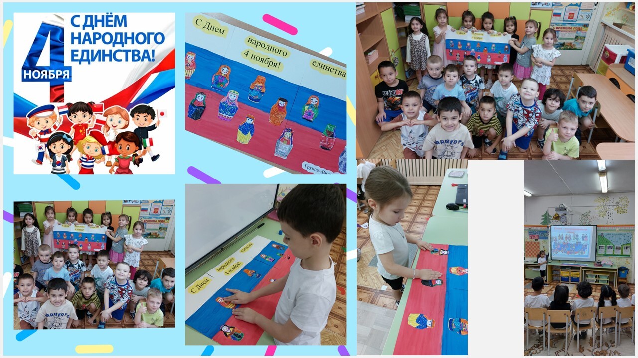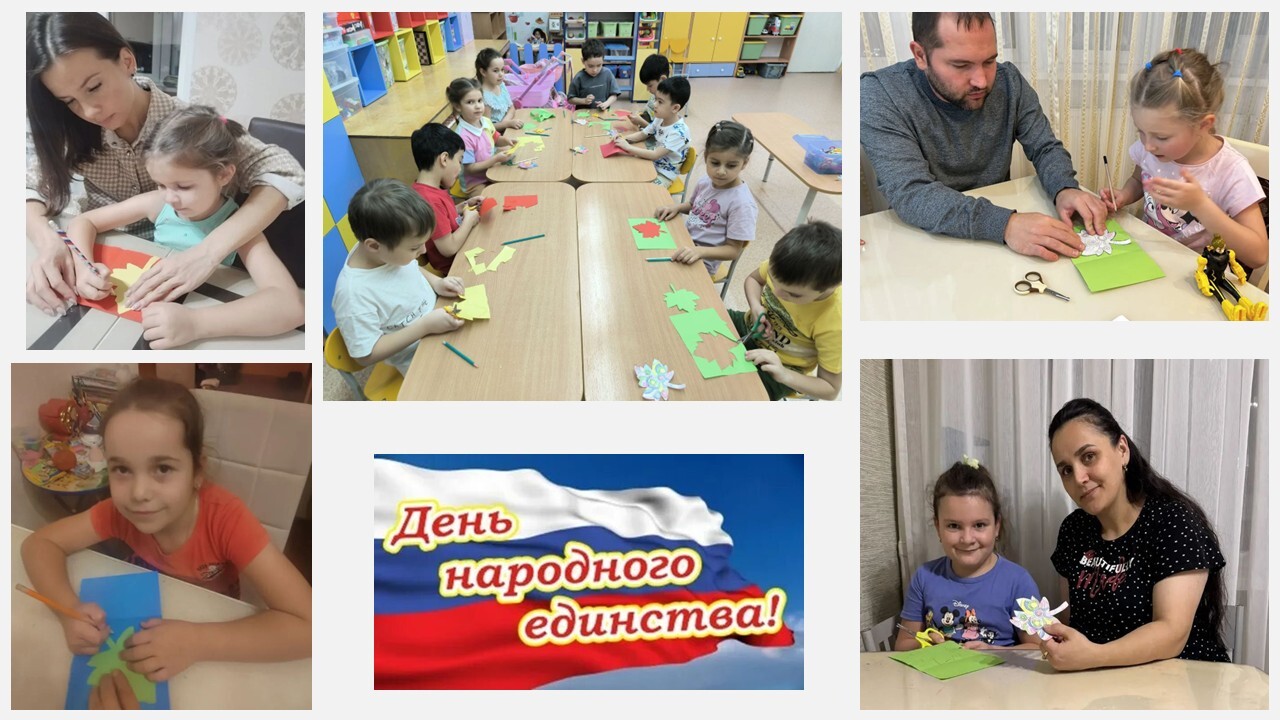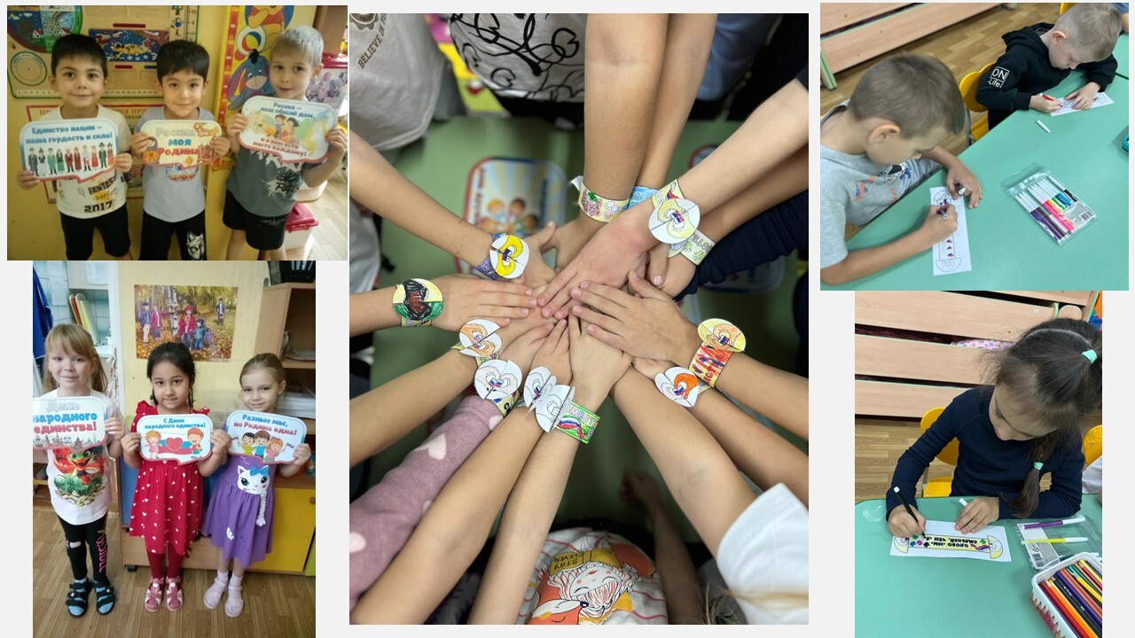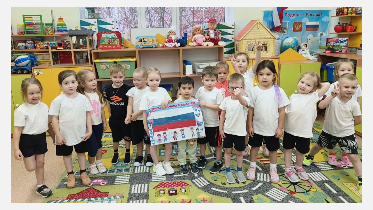 В преддверии празднования Дня народного единства в детском саду «Бусинка» проходят тематические мероприятия, направленные на патриотическое воспитание дошкольников. В день народного единства в группе №12 «Золушка» проводились следующие мероприятия: беседа с презентацией «В единстве народов - великая сила»; ребята слушали и пели песни о дружбе и единстве; поиграли в дидактические игры «Что мы Родиной зовём», «Составь флаг», подвижную игру «Белый, синий, красный»; изготовили подделки «Браслет Дружбы». В группе «Пчёлка» с дошколятами был проведен познавательный час «Россия - Родина моя», где в доступной форме ребята узнали о народах, населяющих Россию, а также закрепили знания о государственных символах России. В группе «Красная шапочка» изготовили «Дерево дружбы», под ветвями которого, взявшись за руки объединились различные народы нашей Родины. В группе «Золотая рыбка» прошёл «Марафон народной сказки», в котором воспитатели читали с детьми сказки различных народов нашей большой страны. Результатом такого марафона стал плакат с флагами стран тех сказок, которые узнали дети.