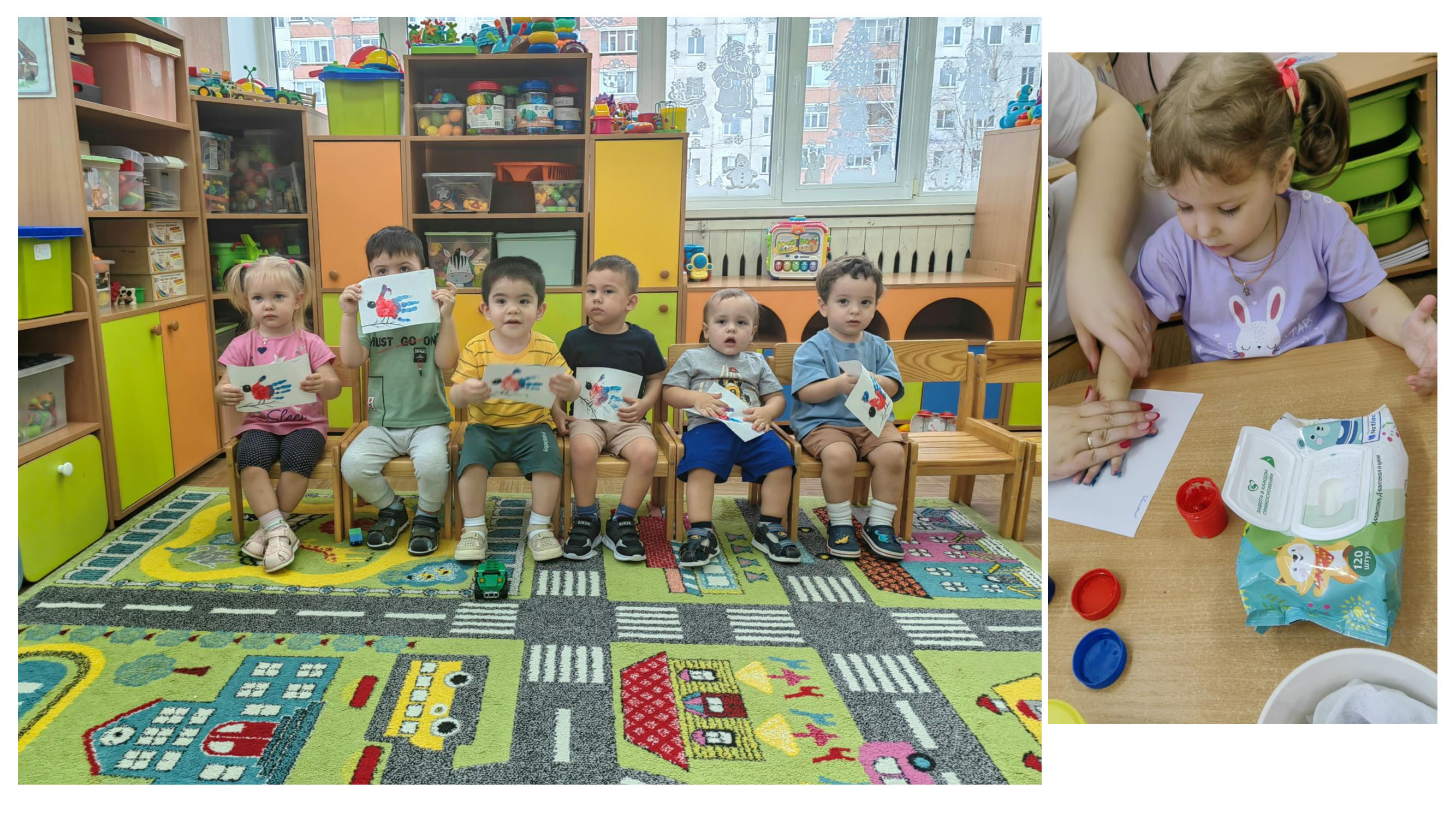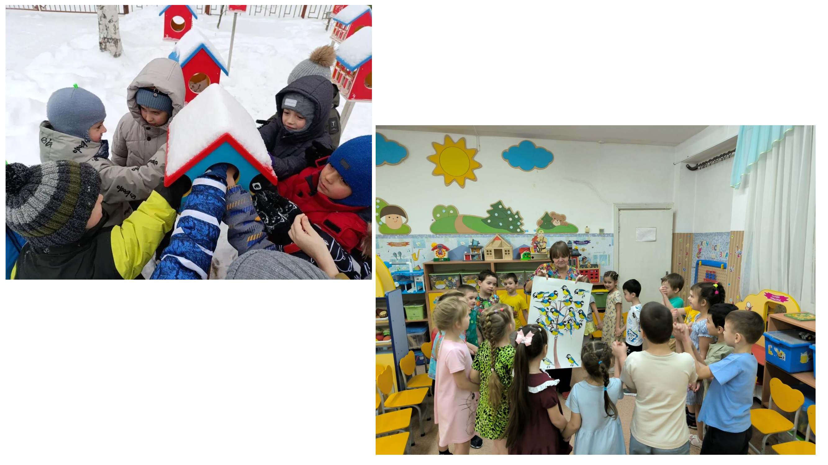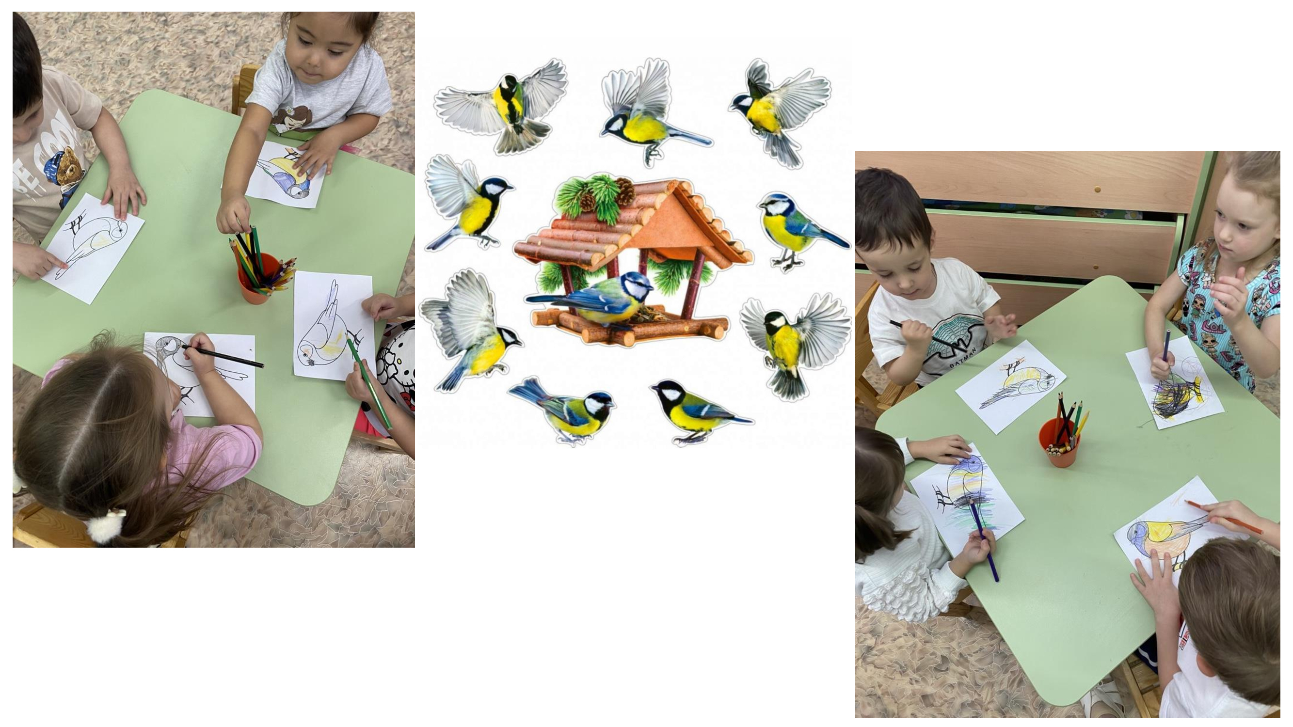 А воспитатели с ребятами групп «Пчёлка», «Красная шапочка» учились правильно и безопасно подкармливать пернатых друзей; ребята групп «Петушок», «Мальвина» и «Колобок» нарисовали рисунки «Непоседа, невеличка - желтогрудая синичка», а воспитанники группы «Красная шапочка» выполнили коллективную творческую работу «Покормите птиц зимой».