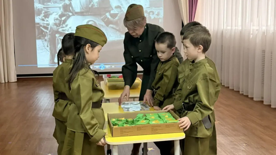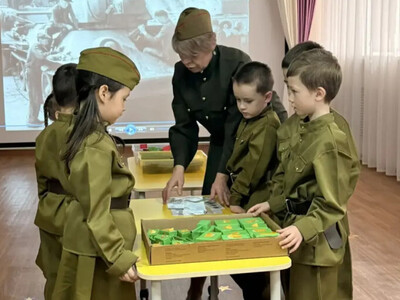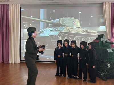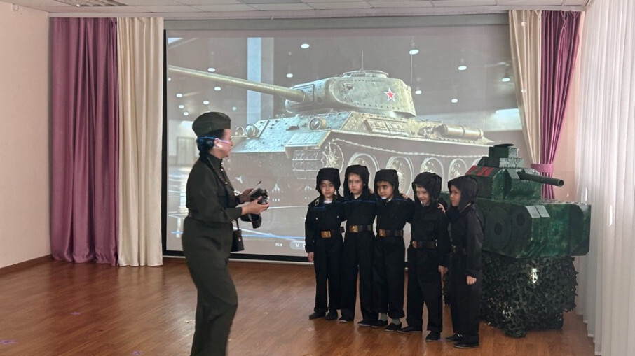 Воспитанники вместе с гостями окунулись в прошлое и развернули на сцене музыкального зала небольшое военное представление «Вспомним, как это было …». Песня Л.Утёсова «Песенка военных корреспондентов» унесла присутствующих в военное время, где еще раз вспомнили о военных корреспондентах, поддерживающих солдат на передовой и оперативно доносящих информацию о ходе боевых действий до жителей тыла, о юных героях, которые работали наравне со взрослыми, внося свой вклад в выпуск танков Т-34 и другой военной техники. Александра М. напомнила нам о героях войны и познакомила нас с героем водителем-механиком Александром Николаевым. Задорные строчки Захара И. «Завтра в бой, а нынче - в пляс, эх, народ, держись у нас!» пригласили ребят на танец «Три танкиста». Приехавшая полевая кухня солдата Эрнеста С. не только накормила танкистов, но и способствовала организации оркестра с ложками «Каша фронтовая». Организованная воспитателем Натальей Евгеньевной совместная деятельность «Конструкторское бюро» показало насколько богаты знания дошколят о Великой Отечественной войне, о Прохоровском сражении, о танке Т-34.